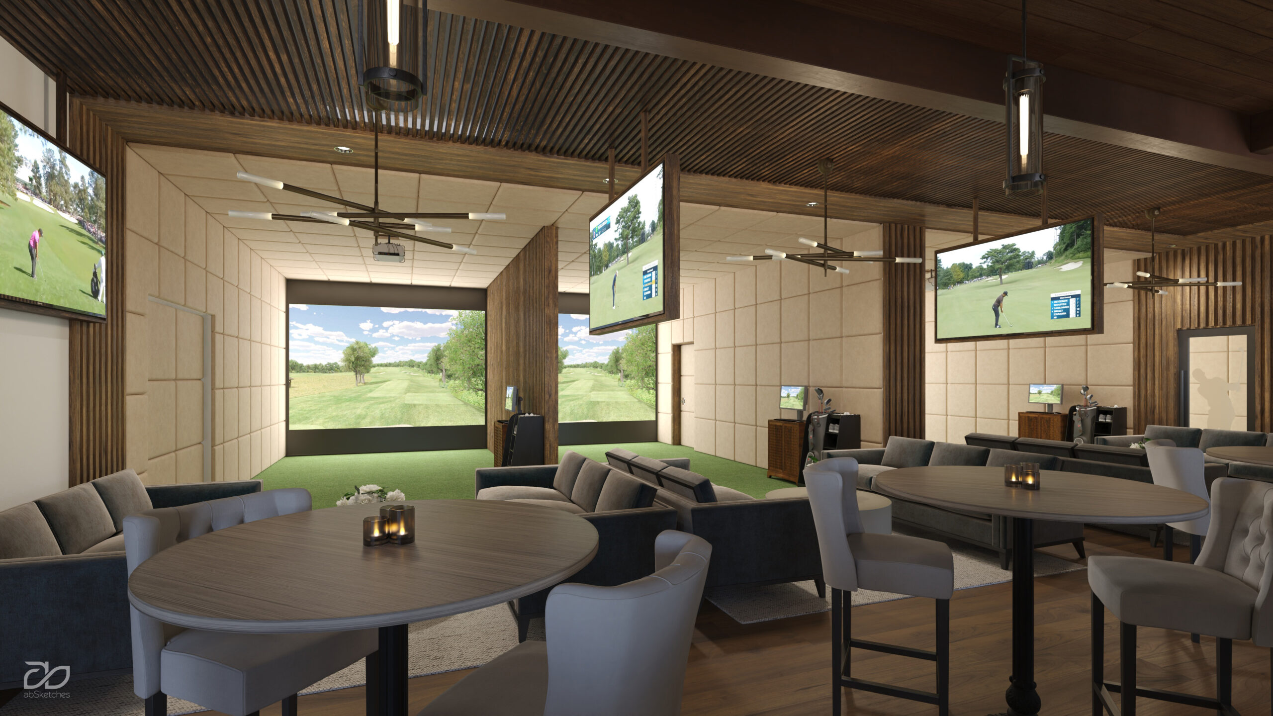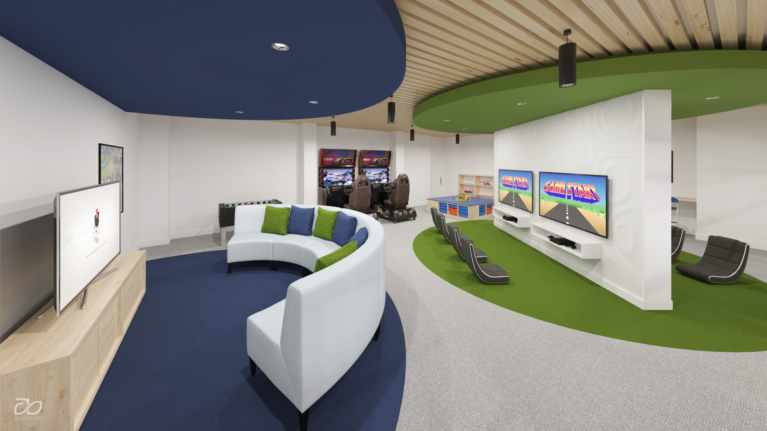 A vibrant casual dining destination seamlessly integrated with cutting-edge simulators and a stylish poolside experience, flowing into a thoughtfully designed kids’ zone for independent play or supervised fun.